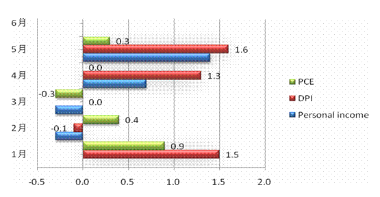 (3)美國政府經(jīng)濟刺激計劃推動了美國人收入增長。盡管由于金融危機的影響使美國家庭消費時有所節(jié)約,但據(jù)美國商務(wù)部的數(shù)據(jù)顯示,5月份個人收入則上升了1.4%,是一年來最大漲幅,并推動儲存率創(chuàng)下15年來新高;個人可支配收入5月份上升了1.6%;消費者支出上漲0.3%。消費者支出的增長顯示經(jīng)濟運行狀況正在出現(xiàn)積極的因素。盡管失業(yè)率較高,但在政府在恢復信貸、增加收入的刺激下,消費者開始表現(xiàn)出消費意愿。