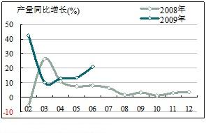 分區(qū)域看,華東地區(qū),受淡季因素影響,上海、江蘇、浙江、安徽6月產(chǎn)量環(huán)比不同程度下滑,但同比增速加快明顯。浙江省6月同比增速23.72%,比2008年同期增速提高34.31個百分點。中南、西南地區(qū)雖受雨水影響,但6月產(chǎn)量環(huán)比依然增長。華北、東北地區(qū)6月仍處于需求旺季,尤其是華北,環(huán)比增長顯著。