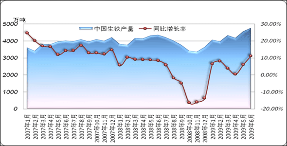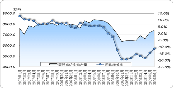 圖1 2007年-2009年全球高爐生鐵產(chǎn)量月度對(duì)比走勢(shì)圖