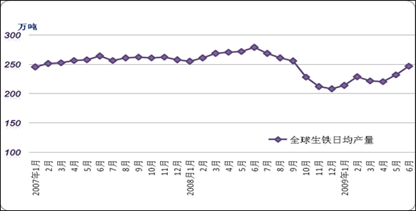 圖2 2007-2009年全球生鐵產(chǎn)量日均走勢(shì)圖