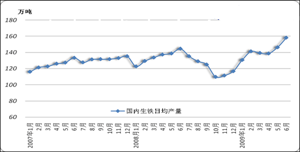 『國(guó)內(nèi)方面』今年上半年,我國(guó)共生產(chǎn)生鐵25879.9萬(wàn)噸,比去年同期增加了1363.96萬(wàn)噸,同比增長(zhǎng)了5.6%。今年前6個(gè)月,我國(guó)生鐵日均產(chǎn)量一路攀升,從1月份日產(chǎn)量的130.84萬(wàn)噸快速上升至6月份的158.43萬(wàn)噸。見圖3、圖4.