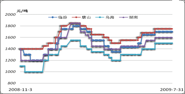 截止到2009年7月底,全國(guó)主要區(qū)域焦炭市場(chǎng)的波動(dòng)情況如下: