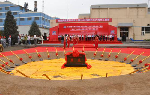 2009年8月28日上午,在偉大祖國(guó)成立60周年慶典之前夕,內(nèi)蒙古蒙西水泥集團(tuán)500萬(wàn)噸熟料基地二期日產(chǎn)4500噸水泥熟料生產(chǎn)線(xiàn)在蒙西高新技術(shù)工業(yè)園區(qū)隆重舉行奠基儀式。