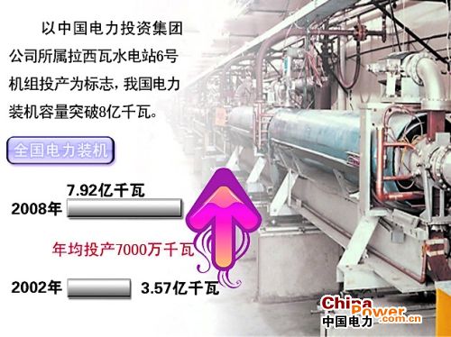 從日前舉行的全國電力工作會議上獲悉,以中國電力投資集團公司所屬拉西瓦水電站6號機組投產(chǎn)為標志,我國電力裝機容量突破8億千瓦。
