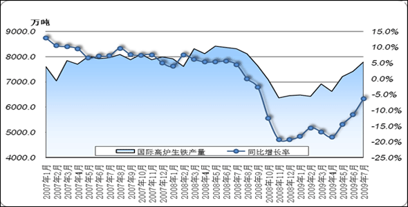圖1 2007年-2009年全球高爐生鐵產(chǎn)量月度對(duì)比走勢(shì)圖