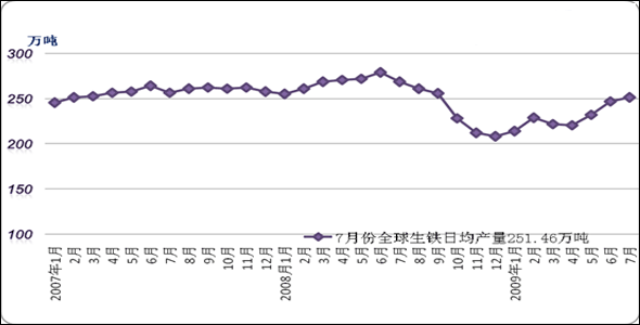 圖2 2007-2009年全球生鐵產(chǎn)量日均走勢(shì)圖