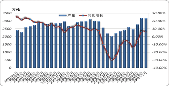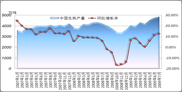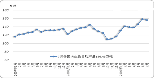 『國(guó)內(nèi)方面』2009年7月,我國(guó)共生產(chǎn)生鐵4850.4萬(wàn)噸,比去年同期增加了617.69萬(wàn)噸,同比增長(zhǎng)了14.6%。今年1-7月份,我國(guó)累計(jì)生產(chǎn)生鐵30879.21萬(wàn)噸,同比增長(zhǎng)7.2%。7月份,我國(guó)生鐵日均產(chǎn)量繼續(xù)保持較高水平,平均日產(chǎn)量為156.46萬(wàn)噸。見圖3、圖4.