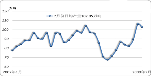 2009年7月,我國(guó)焦炭產(chǎn)量再次問(wèn)鼎最高記錄,達(dá)到了3188.2萬(wàn)噸,比去年同期增加了189.07萬(wàn)噸,同比增長(zhǎng)6.3%;今年1-7月份,我國(guó)累計(jì)生產(chǎn)焦炭19048萬(wàn)噸,同比減少692.77萬(wàn)噸,下降3.5%。7月份,我國(guó)焦炭日均產(chǎn)量繼續(xù)維持較高水平,達(dá)到了102.85萬(wàn)噸。見圖5、圖6。