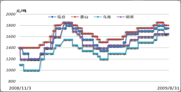 截止到2009年8月底,全國(guó)主要區(qū)域焦炭市場(chǎng)的波動(dòng)情況如下: