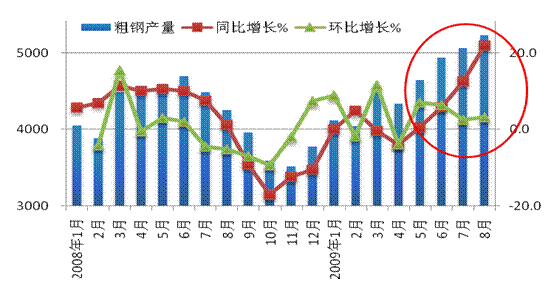 中國鋼鐵產(chǎn)能占全球總量的近一半,因此中國鋼材市場(chǎng)價(jià)格變化對(duì)國際市場(chǎng)有必然的影響。據(jù)國家統(tǒng)計(jì)局統(tǒng)計(jì)數(shù)字,8月份中國國內(nèi)粗鋼產(chǎn)量再度刷新創(chuàng)歷史最高記錄,達(dá)到5233萬噸,同比增長了21.97%;生鐵和鋼材產(chǎn)量分別為4931萬噸和6198萬噸(含重復(fù)材),分別比上年同期增長22.52%和28.90%。粗鋼日產(chǎn)168.8萬噸,環(huán)比增加3.26%。國內(nèi)價(jià)格上次觸底的時(shí)間在4月中旬,4月份粗鋼產(chǎn)量當(dāng)月環(huán)比減少0.4%,5-6月份粗鋼產(chǎn)量再度環(huán)比上升了5%,進(jìn)入3季度粗鋼產(chǎn)量再度環(huán)比上升,盡管環(huán)比升幅有所收窄,但已是連續(xù)第四個(gè)月產(chǎn)量增長。由于去年下半年粗鋼產(chǎn)量繼續(xù)下降,使三季度粗鋼產(chǎn)量同比增速大幅走高,8月份粗鋼產(chǎn)量同比增長了22.0%。