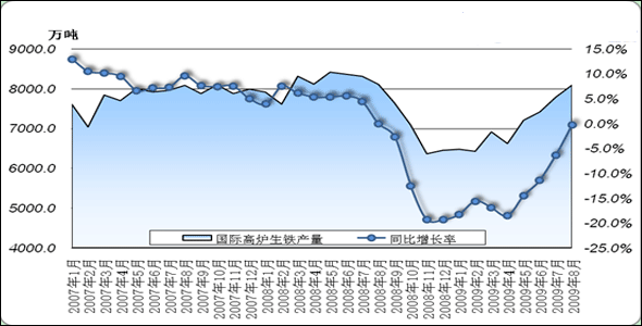 圖1 2007年-2009年全球高爐生鐵產(chǎn)量月度對(duì)比走勢(shì)圖