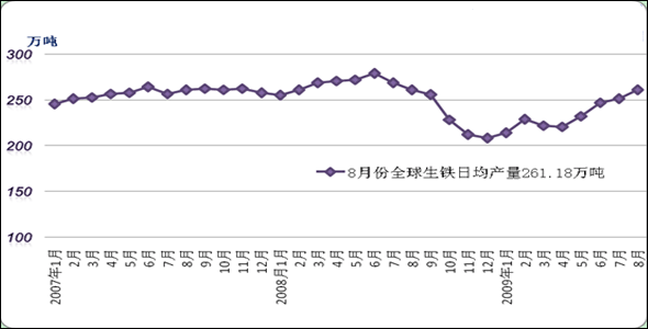 從國際鋼鐵協(xié)會(huì)(IISI)另外公布的全球高爐生鐵產(chǎn)量數(shù)據(jù)來看: 2009年8月,全球40個(gè)主要生鐵生產(chǎn)國共生產(chǎn)高爐生鐵8096.5萬噸,同比下降0.25%,環(huán)比增長(zhǎng)3.19%。8月份全球高爐生鐵的日均產(chǎn)量為 261.18萬噸,再創(chuàng)自去年9月份以來的新高。參考圖1、圖2: