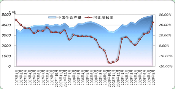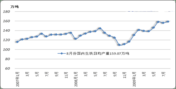 『國內(nèi)方面』2009 年8月,我國共生產(chǎn)生鐵4931.3萬噸,比去年同期增加了906.52萬噸,同比增長(zhǎng)了22.5%。今年1-8月份,我國累計(jì)生產(chǎn)生鐵35796.48 萬噸,同比增長(zhǎng)9.2%。8月份,我國生鐵日均產(chǎn)量繼續(xù)保持較高水平,平均日產(chǎn)量為159.07萬噸。見圖3、圖4.