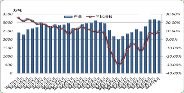 其次,鋼鐵產(chǎn)量增速較快,終端需求增速緩慢。8月份粗鋼生鐵產(chǎn)量再度上升,而同期市場(chǎng)需求卻萎靡不振。鋼材市場(chǎng)在前期高位下跌之后,9月份價(jià)格繼續(xù)深度下行。尤其是以板材為主的品種,鋼廠庫存、市場(chǎng)庫存和產(chǎn)量均保持高位水平,各地價(jià)格已經(jīng)開始出現(xiàn)倒掛現(xiàn)象。鋼鐵產(chǎn)能過剩及盲目的放量生產(chǎn),已經(jīng)導(dǎo)致上游焦炭企業(yè)不斷跟隨,使得焦炭?jī)r(jià)格頻繁的大幅波動(dòng),同時(shí)也增加了焦化企業(yè)的經(jīng)營風(fēng)險(xiǎn)。