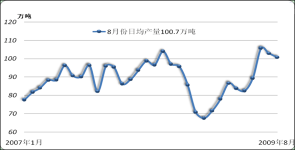 2009年8月,我國共生產(chǎn)焦炭3122.7萬噸萬噸,比去年同期增加257.46萬噸,同比增長(zhǎng)9%;今年1-8月份,我國累計(jì)生產(chǎn)焦炭 22192.74萬噸,同比減少294.09萬噸,下降1.3%。8月份,我國焦炭日均產(chǎn)量環(huán)比繼續(xù)下降,達(dá)到了100.7萬噸。見圖5、圖6。