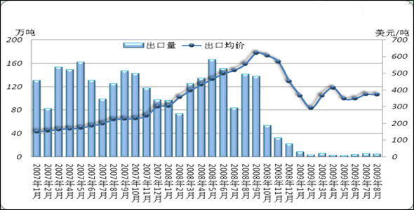 據(jù)海關(guān)總署發(fā)布的數(shù)據(jù)顯示,2009年8月,我國共出口焦炭4.28萬噸,出口總金額為1519.76萬美元。今年1-8月份,我國累計(jì)出口焦炭 33.75萬噸,累計(jì)出口金額達(dá)11902.9萬美元,與去年同期相比,焦炭累計(jì)出口量下降96.7%,出口累計(jì)金額下降97.3%。8月份,焦炭出口均價(jià)合計(jì)為372.55美元/噸,與上個(gè)月基本持平。見圖7。