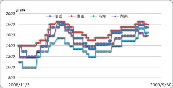 截止到2009年9月底,全國主要區(qū)域焦炭市場(chǎng)的波動(dòng)情況如下: