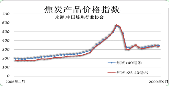 回顧本輪焦炭行情的漲跌變化,可以看出,產(chǎn)能過剩仍然是主導(dǎo)市場(chǎng)驟然變化的主要因素。焦炭既是煉焦煤的下游產(chǎn)品,也是鋼鐵行業(yè)生產(chǎn)的必須原燃料,處于兩大基礎(chǔ)產(chǎn)業(yè)之間,其發(fā)展直接受煤炭和鋼材市場(chǎng)的影響。在全球金融危機(jī)的背景下,鋼材需求受到一定抑制。雖然中央政府4萬億投資促進(jìn)了固定資產(chǎn)投資的快速增長(zhǎng),從而帶動(dòng)鋼材需求較快增長(zhǎng),但是由于國內(nèi)鋼鐵行業(yè)處于產(chǎn)能過剩狀態(tài),鋼材需求的增加極易促使其產(chǎn)能大量釋放,從而造成供給增加、庫存上升、價(jià)格下降,鋼材價(jià)格的下降又會(huì)倒逼同樣處于產(chǎn)能過剩狀態(tài)的焦炭?jī)r(jià)格回落。