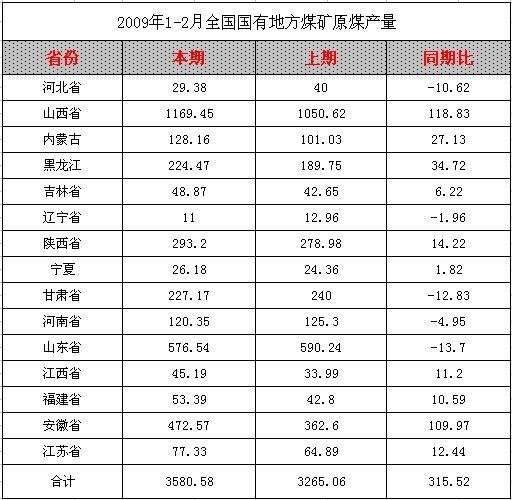 2009年1-2月全國(guó)國(guó)有地方煤礦原煤產(chǎn)量