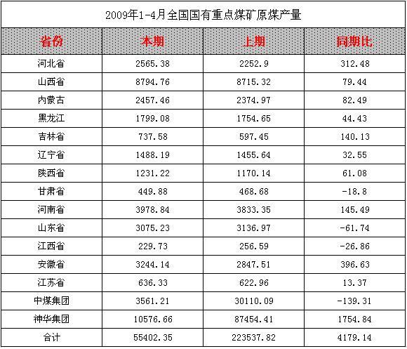 2009年1-4月全國國有重點煤礦原煤產(chǎn)量