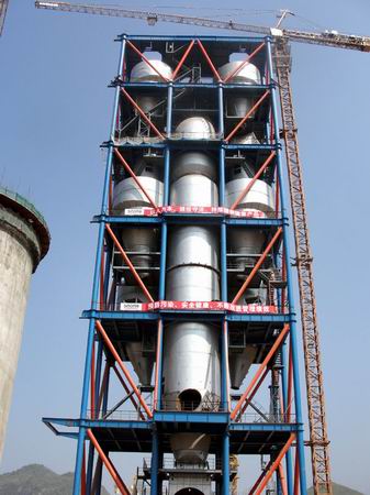 2009年10月28日上午10點(diǎn)28分,由蘇州中材承建的福建安砂建福項(xiàng)目4500t/d熟料水泥生產(chǎn)線窯尾框架如期封頂。