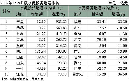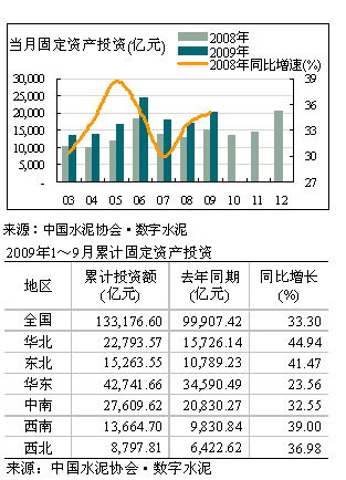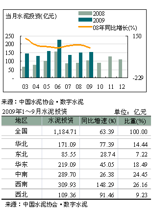 ——1~9月份,全國水泥固定資產(chǎn)投資額為1,184.71億元,投資總額已超過上年全年,同比增長(zhǎng)63.39%;