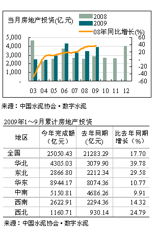 房地產(chǎn)投資自年初以來持續(xù)恢復(fù),9月份的房地產(chǎn)投資達(dá)自8月份大幅提升之后,再度高速增長(zhǎng),當(dāng)月房地產(chǎn)投資達(dá)3,903.13億元,同比增長(zhǎng)37.06%,是2009年以來最高的當(dāng)月增幅。