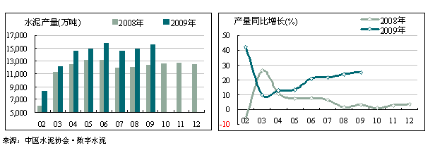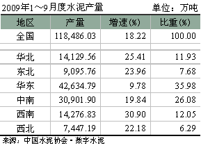 9 月份單月全國共生產(chǎn)水泥15,630 萬噸,是2009年至今為止最高的單月產(chǎn)量,同比增長(zhǎng)速度逐月上升,9月份為25.07%。1~9 月份累計(jì)生產(chǎn)水泥11.8億噸,同比增長(zhǎng)達(dá)18.22%,水泥生產(chǎn)整體繼續(xù)向好。
