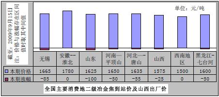 3.焦炭需求減弱,焦炭?jī)r(jià)格走低。9 月份,焦炭市場(chǎng)整體進(jìn)入下跌通道,焦化企業(yè)再度面臨虧損,限產(chǎn)措施執(zhí)行力度較大,由于鋼焦聯(lián)合企業(yè)正常生產(chǎn),供過(guò)于求的狀況并未明顯緩解,焦炭?jī)r(jià)格仍保持穩(wěn)中有跌的態(tài)勢(shì)。為了穩(wěn)定市場(chǎng),山西焦協(xié)要求焦化企業(yè)加大限產(chǎn)幅度,10 月份指導(dǎo)價(jià)格暫穩(wěn)。數(shù)據(jù)顯示,截至10 月15 日,監(jiān)測(cè)區(qū)域內(nèi)焦炭?jī)r(jià)格普遍下跌,其中山東、無(wú)錫等地跌幅較大,另外,安徽和西南地區(qū)價(jià)格無(wú)變動(dòng)。