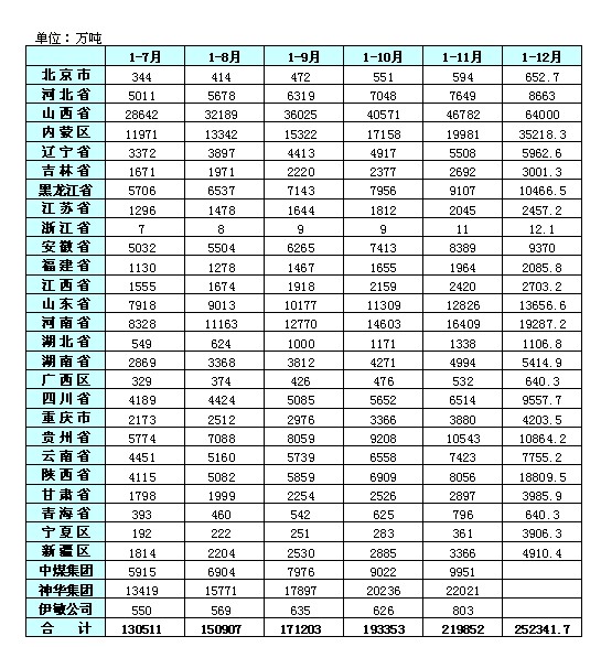 2007年全國(guó)工業(yè)原煤產(chǎn)量統(tǒng)計(jì)