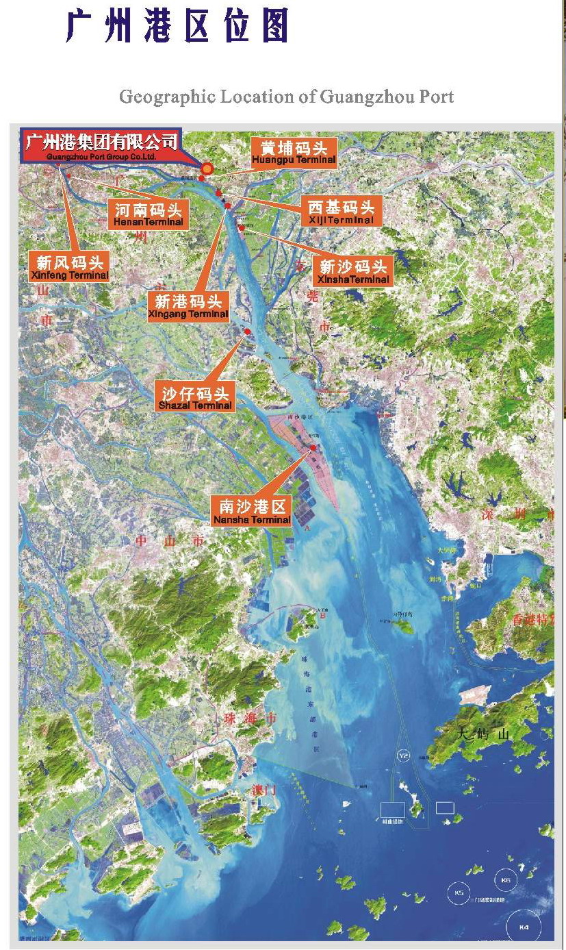 共分為以下8個(gè)碼頭:黃埔集裝箱專用碼頭、西基煤炭專業(yè)碼頭、黃埔雜貨碼頭、南沙一期集裝箱碼頭、南少二期儲(chǔ)裝箱碼頭、新沙碼頭、河南港務(wù)分公司、新風(fēng)港務(wù)分公司。