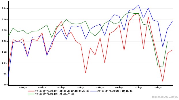 圖1:非金屬建材行業(yè)與建筑業(yè)、房地產(chǎn)行業(yè)的企業(yè)景氣指數(shù)
