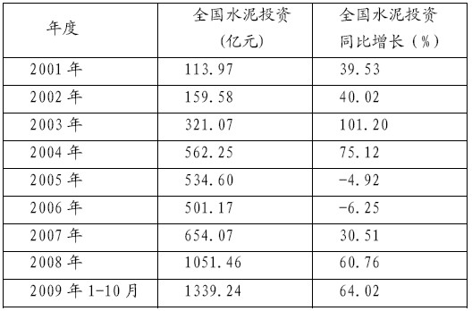 預(yù)計2010年水泥市場可能保持相對平衡的格局,局部的短缺和局部的過剩依然存在 一般水泥新增產(chǎn)能的建設(shè)周期為12-14個月。從表1及圖2可看到:2008年、2009年水泥固定資產(chǎn)投資增長均較快。有關(guān)信息顯示:2009年底我國新增水泥產(chǎn)能可能為2.6億噸左右,2009年我國淘汰落后水泥產(chǎn)能可能為6000——8000萬噸左右。據(jù)此估算,2009年底的實際新增水泥產(chǎn)能約為1.8億噸——2億噸。