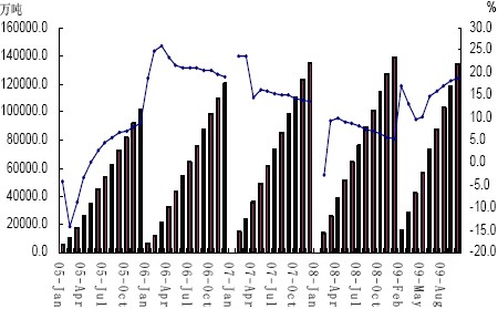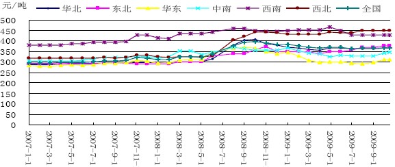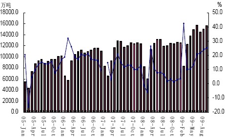 應(yīng)該來說,今年以來水泥的旺盛需求主要來自于4萬億投資啟動(dòng)所帶來的效應(yīng)。在國家整體投資計(jì)劃的拉動(dòng)下,各地區(qū)固定資產(chǎn)投資都出現(xiàn)了顯著提升。東北、西北增速尤為明顯。同時(shí),在去年四季度國家房地產(chǎn)鼓勵(lì)政策的推動(dòng)下來,房地產(chǎn)的銷售出現(xiàn)明顯回暖,同時(shí)房地產(chǎn)投資和新開工也出現(xiàn)了逐步回升的態(tài)勢,2009年10月單月新開工面積同比增速超過50%,環(huán)比增速超過20%,房地產(chǎn)投資對水泥需求的拉動(dòng)對于今年下半年以來水泥產(chǎn)量和價(jià)格的支撐起到重大作用。