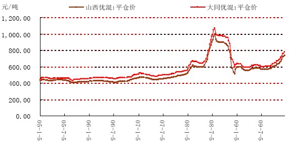 我們考察了2005年以來大同優(yōu)混、山西優(yōu)混的煤炭價(jià)格走勢,發(fā)現(xiàn)煤炭價(jià)