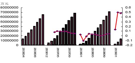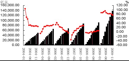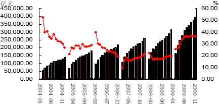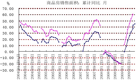 另外,去年四季度以來中央和地方政府的大規(guī)模投資也在今年的施工項(xiàng)目和開工得到體現(xiàn)。2009年1-10月份,累計(jì)施工項(xiàng)目達(dá)到402204個(gè),同比增加95435個(gè),施工項(xiàng)目計(jì)劃總投資375859億元,同比增長(zhǎng)36.6%;新開工項(xiàng)目達(dá)到293412個(gè),同比增加85329個(gè),新開工項(xiàng)目計(jì)劃總投資達(dá)到124610個(gè),同比增長(zhǎng)81.1%。 圖4:新開工項(xiàng)目計(jì)劃總投資額及累計(jì)同比增速 圖5:施工項(xiàng)目計(jì)劃總投資額及累計(jì)同比增速 2.2、房地產(chǎn)投資將成為明年需求的重要看點(diǎn) 對(duì)于房地產(chǎn)繼續(xù)成為明年水泥行業(yè)需求的重要方面,我們的理由如下: 在去年四季度末國(guó)家信貸和行業(yè)優(yōu)惠政策刺激下,09年房地產(chǎn)行業(yè)迅速走出低谷,成交量和成交價(jià)格均大幅上揚(yáng),成交價(jià)格甚至創(chuàng)出新高,之前市場(chǎng)就普遍擔(dān)憂政府會(huì)否再一次祭起調(diào)控大旗。但是近期召開的中央經(jīng)濟(jì)工作會(huì)議表明,“加強(qiáng)和改善宏觀調(diào)控,實(shí)施積極的財(cái)政政策和適度寬松的貨幣政策”、“要把滿足居民合理改善居住條件愿望和發(fā)揮房地產(chǎn)支柱產(chǎn)業(yè)作用結(jié)合起來,增加保障性住房供給,減輕居民合理購(gòu)買自住商品住房負(fù)擔(dān),發(fā)揮房地產(chǎn)在擴(kuò)大內(nèi)需中的積極作用”政府對(duì)未來房地產(chǎn)行業(yè)的發(fā)展還是采取了相對(duì)鼓勵(lì)和肯定的態(tài)度。應(yīng)該來說,在公告中,中央再次強(qiáng)調(diào)了房地產(chǎn)的支柱產(chǎn)業(yè)地位,并且指出要保持房地產(chǎn)市場(chǎng)穩(wěn)定健康發(fā)展,并且作為明年擴(kuò)大內(nèi)需、促進(jìn)經(jīng)濟(jì)平穩(wěn)發(fā)展的主要支柱。 圖6:商品房銷售面積累計(jì)同比增速