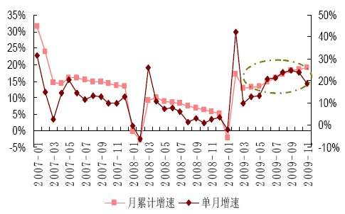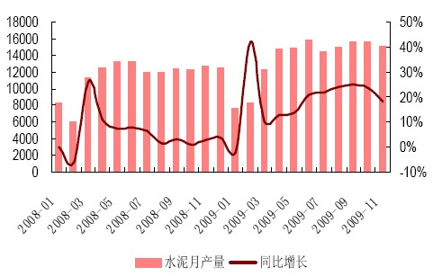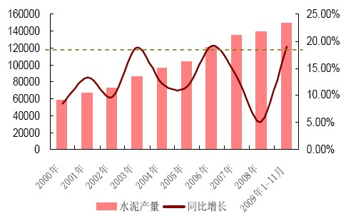 全年水泥產(chǎn)量增速創(chuàng)2000年以來(lái)新高。4萬(wàn)億投資計(jì)劃的推出帶來(lái)的基建投資高增長(zhǎng)對(duì)于今年水泥需求拉動(dòng)效應(yīng)非常明顯,水泥行業(yè)景氣度在2008年的底部基礎(chǔ)上快速拉升,尤其是進(jìn)入下半年,水泥月增速創(chuàng)近幾年來(lái)最高水平。1-11 月水泥產(chǎn)量14.92 億噸,同比增長(zhǎng)19%,預(yù)計(jì)全年超過(guò)16 億噸,比去年新增水泥產(chǎn)量2.5 億噸。 圖1:2009年產(chǎn)量增速與03、06年最高值相當(dāng)