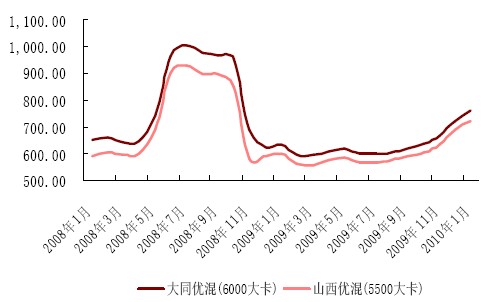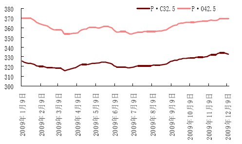 圖3:2009年水泥月產(chǎn)量增速變化 上半年量增價(jià)減,下半年量?jī)r(jià)齊升。09 年上半年水泥產(chǎn)量增速基本上依靠鐵路、公路等基建設(shè)施需求拉動(dòng),下半年房地產(chǎn)投資的回暖和基建投資持續(xù)高增長(zhǎng)雙因素帶動(dòng),下半年水泥行業(yè)景氣高于上半年,從水泥價(jià)格可以明顯看出,如圖所示。 |