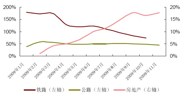 圖5:2009年以來(lái)鐵路、公路、房地產(chǎn)月累計(jì)增速變化