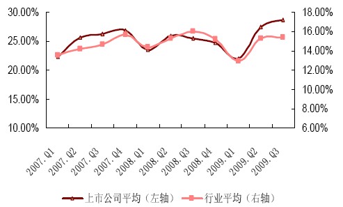 煤炭?jī)r(jià)格總體運(yùn)行平穩(wěn) 水泥行業(yè)季度毛利率環(huán)比、同比均回升。水泥行業(yè)成本中煤炭占比約占30%左右,水泥盈利水平變化對(duì)煤炭?jī)r(jià)格敏感度較高。相比2008年煤炭?jī)r(jià)格的大幅波動(dòng),09年煤炭?jī)r(jià)格總體上運(yùn)行平穩(wěn)。三季度水泥上市公司毛利率28.57%,比二季度環(huán)比提高1 個(gè)百分點(diǎn),比去年同期提高3 個(gè)百分點(diǎn),超過(guò)07年的最高值,統(tǒng)計(jì)局?jǐn)?shù)字顯示,1-8月的水泥行業(yè)總體毛利率達(dá)到15.4%,環(huán)比提高0.2 個(gè)百分點(diǎn),總體上看,水泥行業(yè)盈利水平達(dá)到了較高水平。9 月份以后受大范圍降雪以及冬季供暖等因素影響,煤炭?jī)r(jià)格出現(xiàn)反彈,從我們每周跟蹤的數(shù)據(jù)上看,水泥企業(yè)通過(guò)連續(xù)提價(jià)的方式轉(zhuǎn)移了煤炭上漲帶來(lái)的成本壓力,預(yù)計(jì)四季度行業(yè)盈利水平仍可以維持三季度高水平。