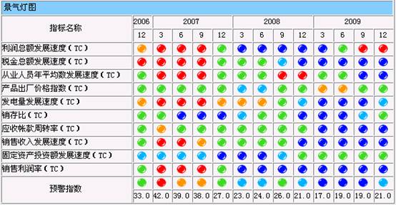 2009年1-4季度,電力行業(yè)預(yù)警指數(shù)的10個構(gòu)成指標(biāo)中,有1個指標(biāo)處于“紅燈區(qū)”,為利潤總額發(fā)展速度;有3個指標(biāo)處于“綠燈區(qū)”:產(chǎn)品出廠價格指數(shù)、銷存比、固定資產(chǎn)投資額發(fā)展速度;有1個指標(biāo)處于“淺藍(lán)燈區(qū)”:發(fā)電量發(fā)展速度;其余5個指標(biāo)處于“深藍(lán)燈”區(qū),它們分別是:稅金總額發(fā)展速度、從業(yè)人員年平均數(shù)發(fā)展速度、應(yīng)收帳款周轉(zhuǎn)率、銷售收入發(fā)展速度。