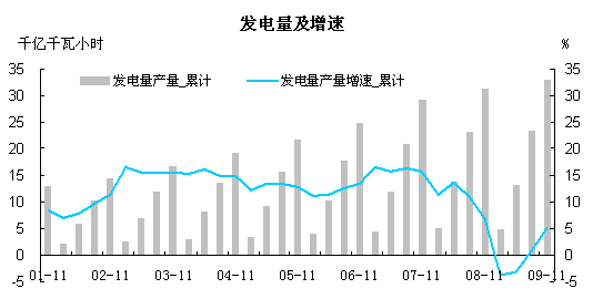 2009年1-11月累計發(fā)電量為32916.4億千瓦,同比增長5.2%,比1-8月增長率提高4.37個百分點,繼前三季度的轉(zhuǎn)正之后迅速上升。