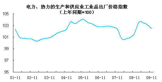 2009年9、10、11月,電力、熱力的生產(chǎn)和供應(yīng)業(yè)工業(yè)品出廠價格指數(shù)分別為101、100.8、100.4,價格漲幅繼續(xù)回落。(上年同期=100)。
