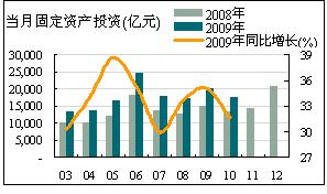 ——城鎮(zhèn)固定資產(chǎn)投資在10月份有所下降,單月同比增長31.65%,較9月份下降3.5個百分點(diǎn),1~10月累計城鎮(zhèn)固定資產(chǎn)投資同比增長33.10%;