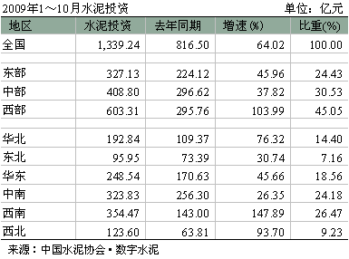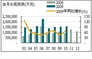 1~10月份,全國水泥累計投資額為1,339.24億元,同比增長64.02%,較1~9月份同比增速有小幅提升。