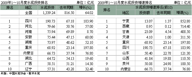 從各省市狀況來看,受災(zāi)后重建的影響,四川地區(qū)水泥投資依然居于全國首位,投資額為190.73億元,同比增長183.90%,增速排名第6位;投資總額和增速位居前10的省市主要位于中西部地區(qū),證實(shí)了政府西部開發(fā)的傾向和經(jīng)濟(jì)發(fā)展重心的偏移對水泥行業(yè)發(fā)展所產(chǎn)生的影響。