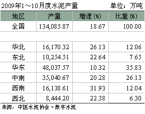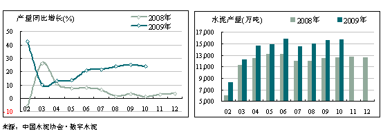 10月當(dāng)月全國水泥產(chǎn)量為15,635萬噸,再次刷新單月最高產(chǎn)量紀(jì)錄;同比增長23.85%,增速比9月減緩1.2個百分點(diǎn)。1~10 月份累計生產(chǎn)水泥13.4億噸,同比增長達(dá)18.67%。這主要得益水泥行業(yè)在9、10月是傳統(tǒng)需求旺季。