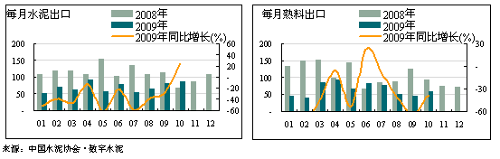 ——10月份水泥出口在9月份同比增長的基礎(chǔ)上繼續(xù)大幅提升,首次實(shí)現(xiàn)了今年以來的同比正增長;熟料出口盡管仍未擺脫負(fù)增長,但較上個月的同比下降幅度已有很大程度的恢復(fù)。
