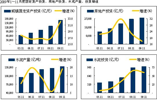 在擴內(nèi)需政策的拉動下,需求快速增長,利潤水平增長,拉動水泥投資持續(xù)火熱: 1~11月全國水泥投資1,505.61億元,同比增長59.8%,與去年同期持平,但仍處于高位增長區(qū)間。預計2009年全年水泥投資約1,650~1,700億元,投資額比2008年約增加600~650億元。