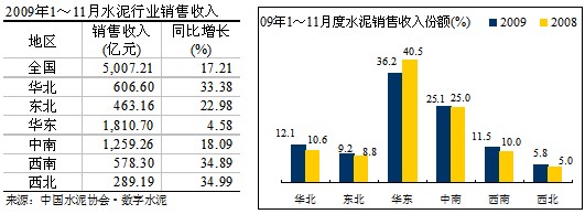 1~11月,水泥行業(yè)實現(xiàn)銷售收入5,007.21億元,同比增長17.21%,增速較2008年同期下降了6.8個百分點。